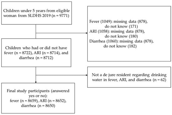 The participants in this study were children under 5 years, born to women aged 15–49 years in Sierra Leone. A total of 16,099 women were selected for individual interviews, with 15,574 successfully completed interviews, yielding a response rate of 97%. Out of the interviewed women, 9771 had children under 5 years. Two weeks prior to the survey, respondents who answered “do not know” regarding fever (171), ARI (180), or diarrhea (182), as well as those who did not respond (878), were excluded from the study. The number of children under 5 years affected by these three conditions was 8722 for fever, 8714 for ARI, and 8712 for diarrhea. Additionally, 62 respondents who were not legal residents (non-de jure residents) were excluded from answering questions related to drinking water sources and diarrhea. Among the final study participants, 8659 were analyzed for fever, 8652 for ARI, and 8650 for diarrhea (Figure 2).