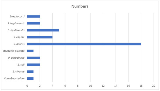 An SSI was defined based on international standards [1,21] with occurrence at the surgical site within 30 days postoperatively (one year for implant-related surgeries) [21]. Furthermore, in the case of clinical suspicion of infection (purulent wound discharge, erysipelas, lymphangitis, dolour, rubor, calor, and/or functio laesa), infection was confirmed by taking several deep tissue and bone samples (mostly intraoperative specimens) for microbiological and histological analyses and in the case of implants for sonication. Additional microbiological examinations, such as polymerase chain reaction, were ordered occasionally. The period of incubation of the intraoperative cultures was 14 days independent of prior antibiotic prescription. The Institute for Medical Microbiology at the University of Zurich processed the samples using VITEK 2 and/or routine cultures based on EUCAST criteria (https://www.eucast.org/clinical_breakpoints; accessed on 11 October 2024) for susceptibility testing.