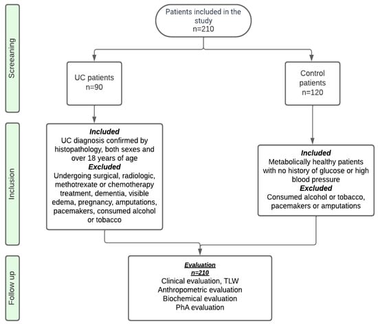 We enrolled patients of both sexes above 18 years with an intestinal biopsy-proven diagnosis of UC. We assessed disease activity by True Love and Witts, asking patients about medication use based on their current prescriptions. We excluded from the study participants with surgical, radiologic, methotrexate, or chemotherapy treatment, dementia, visible edema, pregnancy, amputations, and pacemakers. Besides UC patients, we enrolled a healthy control group with no history of high blood glucose, hypertension, or dyslipidemia. We also excluded participants who consumed alcohol or tobacco due to the possible exacerbation of gastrointestinal symptoms. To ensure accurate measurements, participants were required to be fasting, with no prior fluid intake, and were prohibited from intense exercise and alcohol consumption for one day before the assessment.