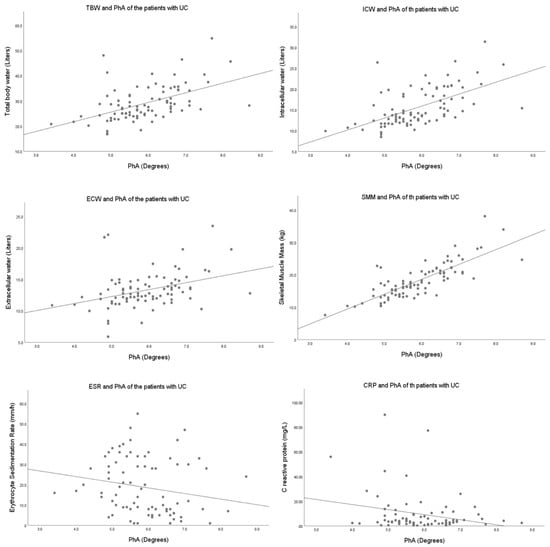 In this study, we found changes related to the amount of ICW and ECW in UC patients compared to controls. This phenomenon may occur because low PhA is associated with altered distribution of ECW, hemoglobin, hematocrit, and muscle mass [], as well as an imbalance of TBW and ECW in patients with cancer [].