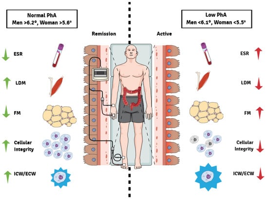 In addition, Cioffi et al. pointed out that inflammation and malnutrition negatively affect the electrical properties of tissue, leading to decreased PhA in UC patients compared to healthy individuals [,]. This phenomenon occurs because acute inflammation is the body’s response to damage under transitory conditions; however, when inflammation becomes chronic, as in IBD patients, tissue damage and physiological imbalance occur due to the abnormal production of proinflammatory cytokines []. Inflammation related to disease activity leads to low PhA. In our population of UC patients, lower PhA was more evident in patients with active disease than in patients in remission, and this reduction was more significant in women. Thus, active disease and female sex can be considered factors related to malnourishment in UC; nevertheless, we need to conduct further studies before making solid conclusions [].