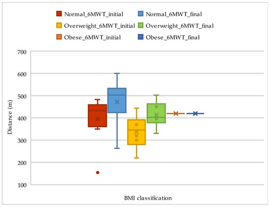 Figure 1 and Figure 2 present data on walking distance from the 6MWT over time, comparing different BMI groups and showing the distance yield, based on BMI classification, as presented in Table 3.
