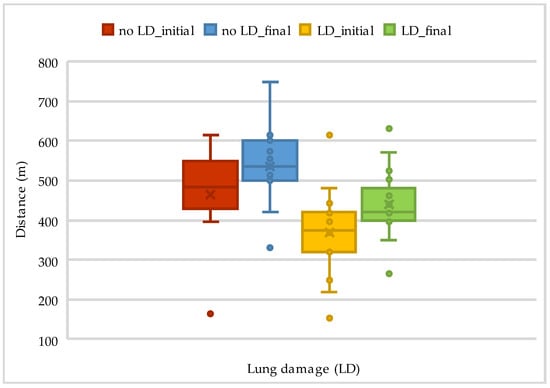 - The 6MWT distance at admission with exertion at admission (p < 0.05, r = −0.403), lung damage (p < 0.05, r = −0.399), D-dimers (p < 0.01, r = −0.620), and fibrinogen (p < 0.01, r = −0.438);