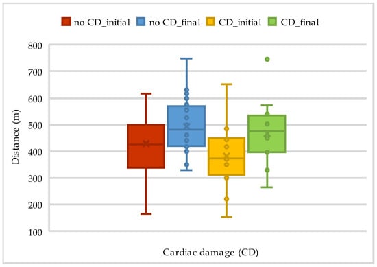 Seven patients had cardiac damage, which affected the results of both the 6MWT and Borg exertion, as presented in Table 7 and Figure 6 below.
