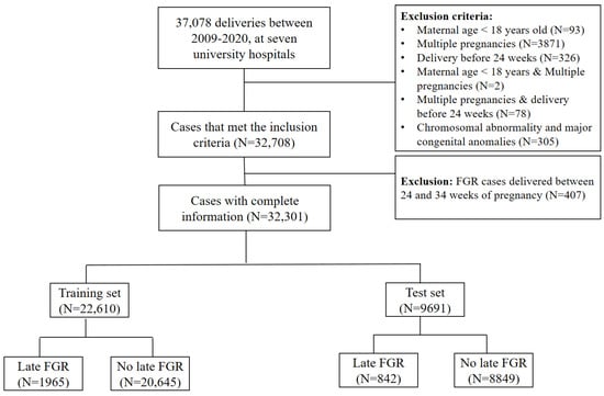 After applying the exclusion criteria to 37,078 pregnancies, the final cohort that met the eligibility criteria included 32,301 women (Figure 1). Late FGR was diagnosed in 2807 pregnancies (8.69%) in the entire cohort, with 1965 (8.69%) and 842 (8.69%) pregnancies in the training and test sets, respectively. The baseline characteristics of the patients are described in Table 1.