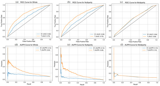 Machine learning predictive models at E1 and T1 time points with original variables for late FGR (test set). (a) AUC curves in the whole cohort; (b) AUC curves in the nulliparous cohort; (c) AUC curves in the multiparous cohort; (d) AUPR curves in the whole cohort; (e) AUPR curves in the nulliparous cohort; (f) AUPR curves in the multiparous cohort. FGR, fetal growth restriction; AUC, area under the curve; AUPR, area under the precision-recall curve.
