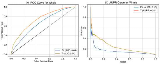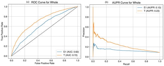 Performance of the simplified prediction model at E1 and T1 time points for late FGR in the entire cohort (test set). (a) AUC curves; (b) AUPR curves. FGR, fetal growth restriction; AUC, area under the curve; AUPR, area under the precision-recall curve.
