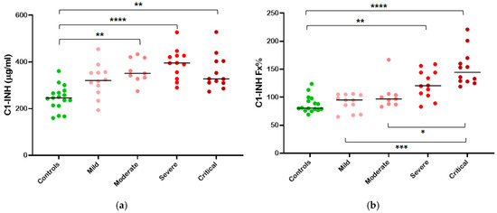 In our study, we observed an increase in plasma concentrations of C1-INH, both total and functional, in all COVID-19 patients (Figure 1). This is consistent with C1-INH being an acute phase protease and mostly confirms transcriptomic and proteomic studies from the literature [25,29,57]. In particular, a direct correlation was observed between the increase in C1-INH levels, especially functional levels, and the WHO classification of COVID-19 severity (Figure 1b).