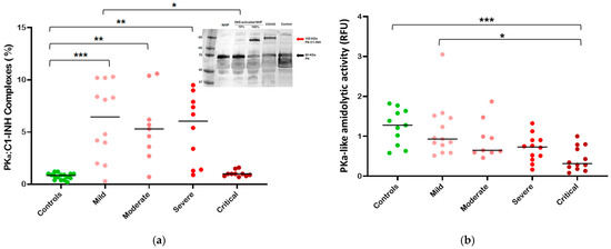 Once more, we found that the quantity of PKa:C1-INH complexes was significantly higher when considering patients with mild to intermediate severity disease compared to healthy controls. No statistically significant differences emerged between controls and critically ill patients (Figure 3a).