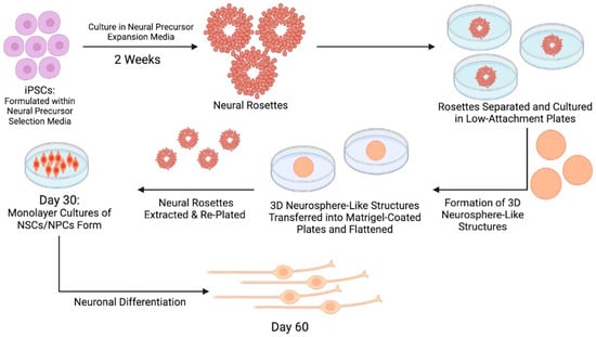 Despite the need for additional pre-clinical and clinical testing to better solidify the most optimal source of stem cells for peripheral nerve damage, it is clear that the potential use of stem cells in peripheral nerve regeneration shows great clinical promise [51]. Regardless of the stem cell source, inducing stem cell differentiation into various neuronal cell types is a delicate and time-consuming process [26]. Each neuronal stem cell line has a unique differentiation protocol, many of which are still under investigation for optimization at this time. In one commonly replicated cell culture protocol starting with induced pluripotent stem cells (iPSCs), the process requires stem cell culture within a formulated neural precursor selection medium, followed by culture in a neural precursor expansion medium for a total of 2 weeks to form neural rosettes. At this stage, the cell conglomerates, termed neural rosettes, will begin to express neuronal stem cell markers, and the rosettes are then divided and cultured into multiple, separate low-attachment plates where they begin to form 3D neurosphere-like structures containing aggregates of neural rosettes. Then, the neurosphere-like structures are transferred into Matrigel-coated plates, flattened, and the neural rosettes are extracted. Finally, the rosettes are re-plated to form new, purified neurosphere-like structures that are eventually used to develop monolayer cultures of neural stem cells (NSCs) and early neuronal progenitor cells (eNPCs). This whole process from iPSC to NSC/eNPC takes around 30 days and can take up to 60 days for complete neuronal differentiation [52]. Once the desired quantity of stem cells has been isolated, the cells can be directly extracted and used in treatments, or they must be preserved to retain their function [37]. The complete stem cell culture process is visually depicted in Figure 2.