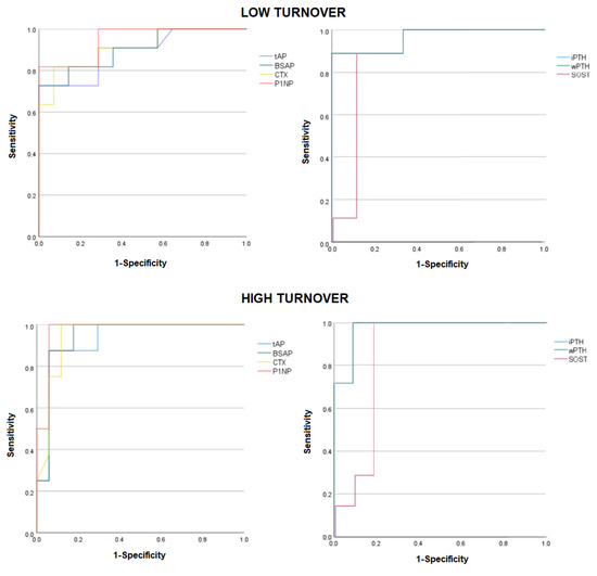 Consistent with previous reports [19,28], significant differences in the biomarkers of bone formation and resorption, as well as PTH and SOST levels, were observed between patients with low and high turnover. The levels of iPTH and P1NP showed high and comparable accuracies when identifying low bone turnover. In our study, the association of PTH and alkaline phosphatase was the best and most accurate indicator for identifying high turnover, in agreement with Sprague et al. [19]. It is noteworthy that Kidney Disease: Improving Global Outcomes (KDIGO) guidelines suggest that turnover should be evaluated using iPTH and BSAP [29,30].