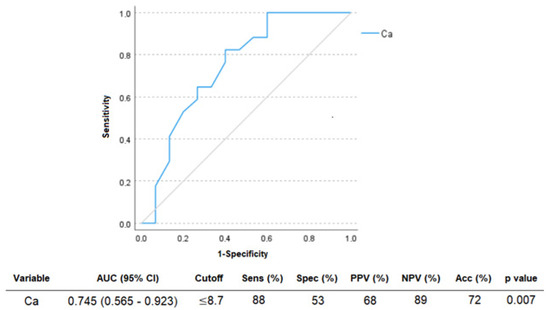 The ROC curve was used to discriminate between normal and abnormal mineralization. Calcium was used to identify patients with a mineralization defect (AUC 0.745, p 0.007). The ROC curve, cutoffs, predictive values, and accuracy are shown in Figure 2.