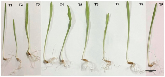| Treatment | Shoot Length (SL) (cm) | Root Length (RL) (cm) | Seedling Length (SEL) (cm) | Seedling Fresh Weight (FW) (g) | Seedling Dry Weight (DW) (g) | Water Content (WC) (%) |