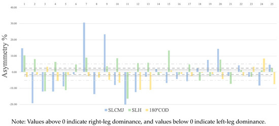 - Fort-Vanmeerhaeghe, A.; Bishop, C.; Buscà, B.; Aguilera-Castells, J.; Vicens-Bordas, J.; Gonzalo-Skok, O. Inter-limb asymmetries are associated with decrements in physical performance in youth elite team sports athletes. PLoS ONE 2020, 15, e0229440. [Google Scholar] [CrossRef]
