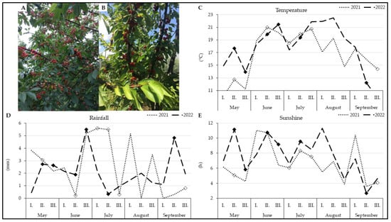 Sweet cherry genotypes and climatic data with terms of harvest (BBCH 65–92), marked by diamonds, during season 2021 (dot lines and white diamonds) and 2022 (dash lines and black diamonds): (A) Kordia; (B) Regina; (C) Temperature; (D) Rainfall; (E) Sunshine. Roman numbers mark the third of each month.