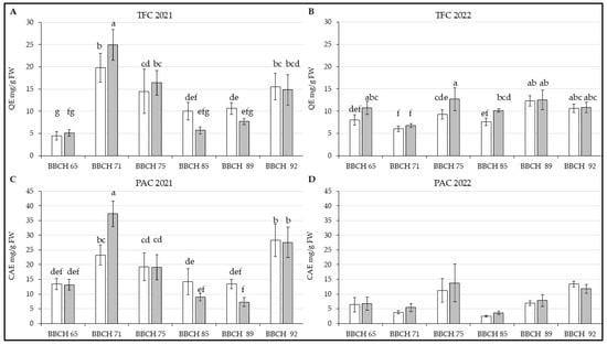 In 2022 (Figure 3D), PAC was increased in BBCH 75 and BBCH 92 in both genotypes in comparison with rest of phenological stages, but there were no significant differences between Kordia and Regina as well as terms of harvesting [F(5, 66) = 1.0314; p = 0.40662]. In comparison with previous results, PAC in both genotypes gradually increased from BBCH 85 to BBCH 92.