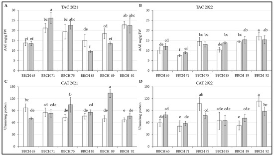 The progress of TAC measured in leaves of Kordia was similar to PAC 2022, but there was difference in the case of Regina [Figure 4B; F(5, 66) = 6.9589; p < 0.01]), where the decrease in BBCH 85 had not been measured.