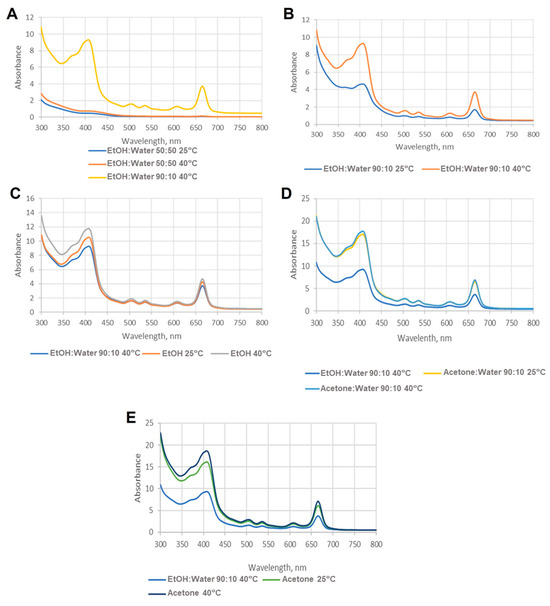 Considering the parameter temperature, it is possible to infer that a higher temperature (40 °C vs. 25 °C) was a determinant factor in improving the carotenoid content extracted (Table 3, Figure 1A–E). Indeed, as observed in Figure 1, the higher the temperature, the higher the absorbance intensity in all the cases presented.