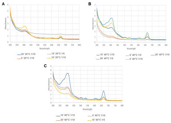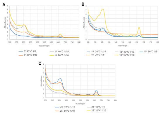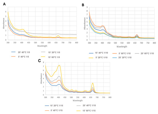 Spectra of MAE extracts, where (A–C) represent the results of the different solid/solvent ratios: (A)—1/5; (B)—1/10; (C)—1/15 g/mL.