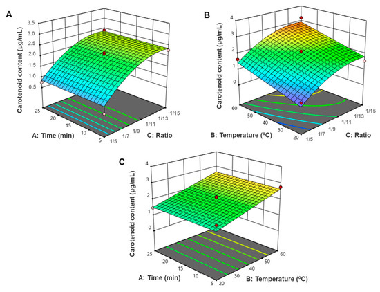 The parameters considered for BBD were time, temperature, and solid/solvent ratio, which varied between 5–25 min, 20–60 °C, and ratios of 1/5 to 1/15 g/mL, respectively according to Table 1. In total, 15 runs (with 3 central points) were performed. Total carotenoid content (µg/mL) was considered the dependent variable.