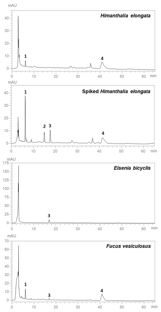 HPLC-DAD chromatograms obtained at 450 nm with the optimized MAE extracts of H. elongata, H. elongata spiked with the four carotenoid standards, E. bicyclis, and F. vesiculosus. Identity of the compounds as in Table 6.