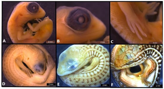 - Wise, P.A.D.; Vickaryous, M.K.; Russell, A.P. An Embryonic Staging Table for In Ovo Development of Eublepharis macularius, the Leopard Gecko. Anat. Rec. 2009, 292, 1198–1212. [Google Scholar] [CrossRef]