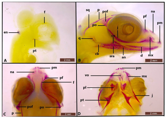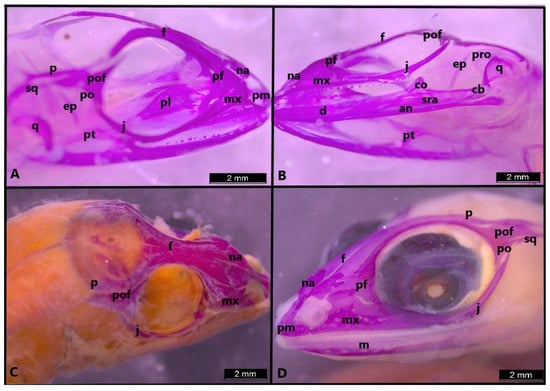 - Wassersug, R.J. A procedure for differential staining of cartilage and bone in whole formalin fixed vertebrates. Stain Technol. 1976, 51, 131–134. [Google Scholar] [CrossRef]