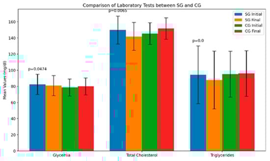 | Triglycerides T1 (mg/dL) | SG | 94.40 * | 35.76 | * = 0.000 |