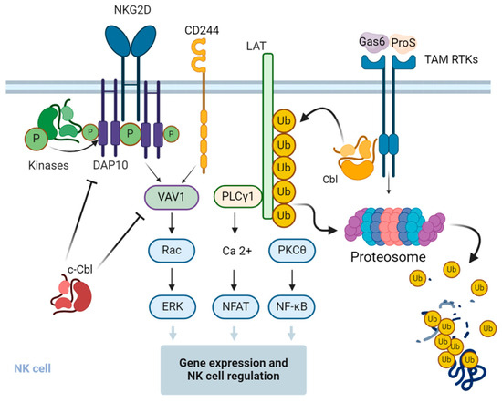 Regulation of signal transduction pathways and function of NK cells by Cbl. c-Cbl ubiquitinates the stimulatory receptor NKG2D on NK cells, leading to the endocytosis and degradation of the activation signaling complex. c-Cbl also mediates non-degradative ubiquitination of VAV1, a regulator of signal transduction pathways downstream of the NKG2D and 2B4 stimulatory receptors, and negatively regulates their downstream signaling pathways in NK cells. Upon interaction with the cognitive ligands, the growth arrest-specific gene 6 (Gas6) and protein S (ProS) and the Tyro3, Axl, and Mer (TAM)-family receptor tyrosine kinases (RTKs) phosphorylate and activate Cbl-b, which in turn promotes the ubiquitination of the adapter protein linker for activation of T cells (LAT), followed by its proteasomal degradation. This results in the inhibition of LAT-dependent signaling pathways that otherwise promote cytokine and chemokine production in NK cells. The figure was created using BioRender.com (www.biorender.com, accessed on 14 July 2024).
