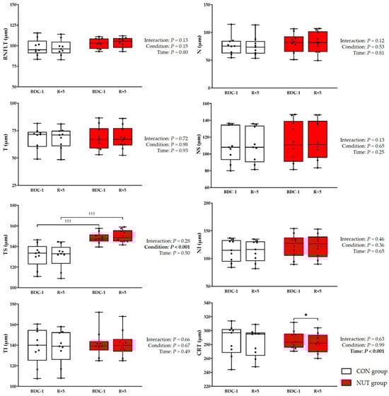 Optical coherence tomography data before (BDC-1) and after (R+5) head-down bed rest. CRT: central retinal thickness, N: nasal, NI: nasal inferior, NS: nasal superior, RNFLT: retinal nerve fibre layer thickness, T: temporal, TI: temporal inferior, TS: temporal superior. Black dots represent individual points. The box represents the interquartile range from the 25th to 75th percentile. The middle line represents the median. The whiskers extend from the minimum to the maximum value. †††: p < 0.001 vs. the same period in CON group, *: p < 0.05 vs. BDC-1 in NUT group.