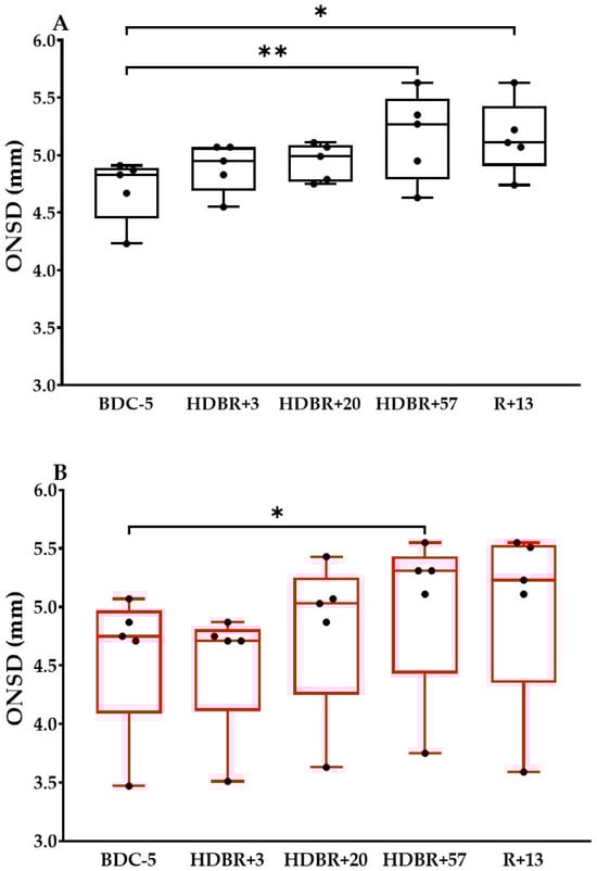 Optic nerve sheath diameter (ONSD) measurements before (BDC-5), during (HDBR+3, HDBR+20, HDBR+57) and after (R+13) head-down bed rest in control (A) and antioxidant cocktail (B) groups. Black dots represent individual points. The box represents the interquartile range from the 25th to 75th percentile. The middle line represents the median. The whiskers extend from the minimum to the maximum value. * p < 0.05 vs. BDC-5, ** p < 0.01 vs. BDC-5.