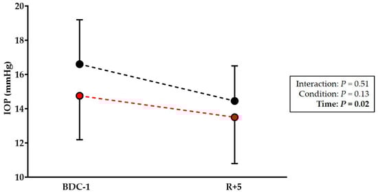 Two-way ANOVA indicated that there was a main effect of time (p = 0.02) on the IOP. Post hoc comparisons revealed a non-significant drop in the IOP in the CON group at R+5 (p = 0.07). It must be emphasized that eight of the ten volunteers had a diminished IOP. However, in the NUT group, the IOP remained unchanged at R+5 (p = 0.37) (Figure 4).