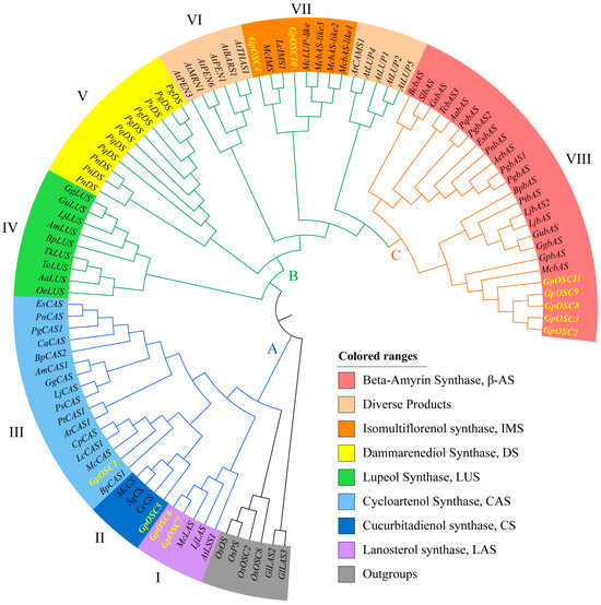 To further elucidate the evolutionary relationship of the OSC gene family in G. pentaphyllum, a phylogenetic analysis was conducted on the GpOSC genes and those of other reported dicotyledonous plants, including A. thaliana, P. ginseng, and M. charantia (Table S1). The OSC genes from the monocotyledonous plant Oryza sativa and the fungus Ganoderma lucidum were used as outgroups. The results indicated that all OSC genes could be divided into eight distinct subfamilies (Figure 1). Upon a further analysis of various branches within the phylogenetic tree, it was observed that synthase genes encoding cycloartenol, lanosterol, and cucurbitadienol formed Group A, which included GpOSC6, GpOSC7, GpOSC1, and GpOSC5. Group B comprised gene branches responsible for encoding lupeol synthase, dammarenediol synthase, and other functions, with GpOSC10 and the β-AS-like genes from M. charantia clustering together, while GpOSC4 was identified as an IMS gene. Genes encoding β-amyrin synthase (β-AS) were classified into Group C; within this group, GpOSC11, GpOSC9, GpOSC8, GpOSC3, and GpOSC2 formed monophyletic branches.