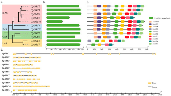 Phylogenetic relationships (a), protein domain (b), conserved motifs (c), and gene structure (d) among 11 GpOSC proteins.