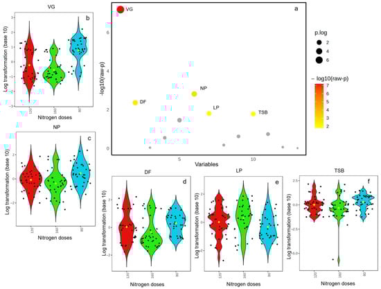(a) Important variables selected by the Kruskal–Wallis test plot with a p-value threshold of 0.05. (b) Vegetative growth (days) (VG) across nitrogen fertilization levels; (c) NP: number of panicles (n); (d) DF: days to flowering (days); (e) LP: panicle length (cm); (f) TSB: 1000 seed weight.