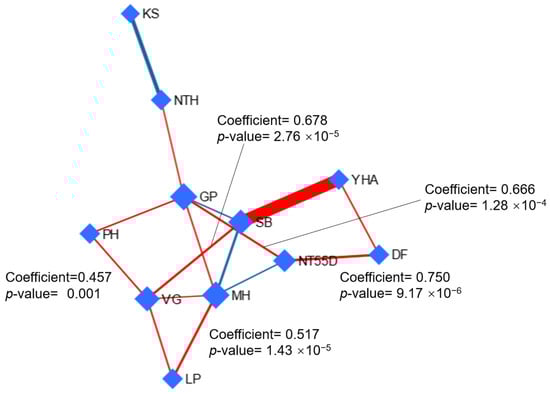 Debiased sparse partial correlation network. The p-value and correlation partial coefficient are shown for some important variables. Note: In the DSPC network, nodes are the input variables, while edges represent association measures. Variables with stronger associations are clustered together, and the edges between them are wider. Red lines show a positive correlation, while blue lines show a negative correlation with variables. VG: vegetative growth (days); DF: days to flowering (days); PH: plant height (cm); NT55D: number of tillers at 55 days (n); NTH: number of tillers at harvest (n); LP: panicle length (cm); GP: grains per panicle (n); KS: empty grains (percentage); MH: moisture at harvest (%); SB: sample biomass (g); YHA: yield per hectare (kg).