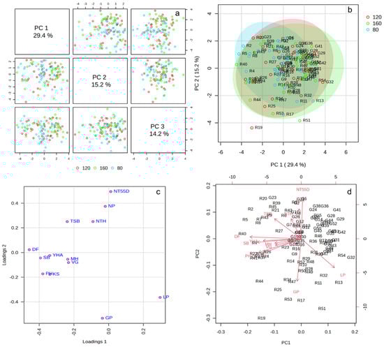 The plot shows some separation among the nitrogen treatments, though there is considerable overlap, particularly between the green (160 kg·ha−1) and blue (80 kg·ha−1) groups, suggesting that the two nitrogen doses exhibited similar responses along these two principal components (Figure 3b). The red group (120 kg·ha−1) shows more spread, with a few outliers (e.g., R19), indicating more variability in its response.