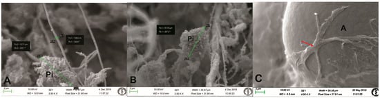 Scanning electron microscopy images of the human pineal gland using a modified freeze-fractured sample procedure. (A,B) Pinealocytes (Pi) with round or elongated shape [measuring from 8.3 µm (B) to 10.71 µm (A)], surrounded by thin non-myelinated nerve fibres, measuring 0.7 µm in diameter; orig. magn. 3500×. (C) Intimate contact of an interstitial glial cell (astrocyte) (arrow) with inorganic material of an acervulus (A), orig. magn. 4000×.