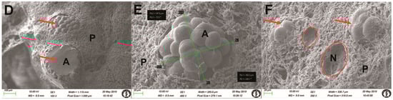 Scanning electron microscopy images of the human pineal gland using a modified freeze-fractured sample procedure. (A) The structure was comprised of artificially fractured, non-aggregated, irregular mulberry-like acervuli arranged in a “nest-like” configuration surrounded by pinealocytes, interstitial glial cells (astrocytes), and nerve fibres. The dimensions are 55 µm × 60 µm. A—acervulus, P—parenchyma, orig. magn. 848×. (B) The structure was characterised by the presence of an artificially fractured mulberry-like acervulus, situated within a “nest-like” configuration and displaying a regular pattern. This was surrounded by a complex network of cells including pinealocytes, interstitial glial cells (astrocytes), and nerve fibres. A—acervulus, P—parenchyma, orig. magn. 200×. (C) The detailed structure of the aggregated mulberry-like acervuli on the artificial fractured area. The structure appeared to exhibit growth patterns or concentric rings, as observed under a magnification of 1000×. (D) The parenchyma of the gland contained both intact and artificially cut mulberry-like regular acervuli (red arrows). A—acervulus, P—parenchyma, orig. magn. 103×. (E) The non-aggregated mulberry-like acervuli were situated within a “nest-like” structure surrounded by pinealocytes, interstitial glial cells (astrocytes), and nerve fibres. The dimensions of the structure are 148 µm × 162 µm. A—acervulus, P—parenchyma, orig. magn. 400×. (F) Following the removal of the acervuli (red arrows), the location appeared to resemble “nest-like” structures (circles) created as an imprint of the parenchyma surrounded by pinealocytes, interstitial glial cells (astrocytes), and nerve fibres. N—nest, P—parenchyma, orig. magn. 350×.
