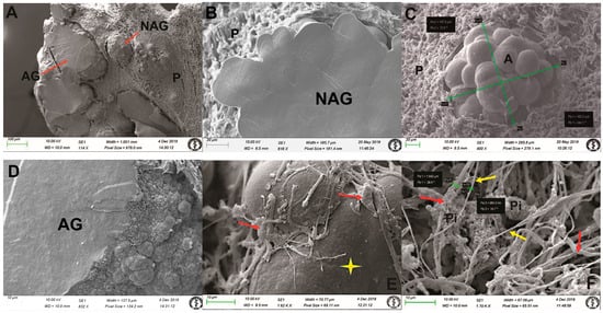 Scanning electron microscopy images of the human pineal gland, obtained through a modified freeze-fractured sample procedure. (A) Overview image of artificial surface with the presence of aggregated (AG) and non-aggregated (NAG) acervuli embedded in the parenchyma (P) of the gland, orig. magn. 114×. (B) Representative surface of an artificially fractured non-aggregated (NAG) acervulus within the parenchyma (P), orig. magn. 616×. (C) Surface of non-aggregated (NAG) mulberry-like acervuli (A) (size 148 µm × 162 µm) embedded in parenchyma (P), orig. magn. 400×. (D) Representative surface of both artificially fractured and natural surface of aggregated (AG) acervuli, orig. magn. 832×. (E) The arrows indicate intimate connection of pinealocytes with nerve fibres to the acervulus (yellow star), orig. magn. 1620×. (F) A tangle of non-myelinated nerve fibres (yellow arrows) within the parenchyma of the gland, in close proximity to pinealocytes (Pi). The thickness of the thinner (yellow arrows) to thicker (red arrows) nerve fibres varied from 0.7–1.6 µm, orig. magn. 1700×.