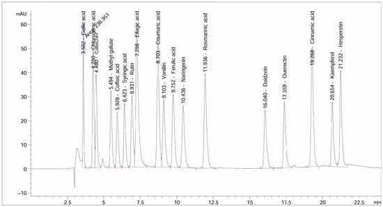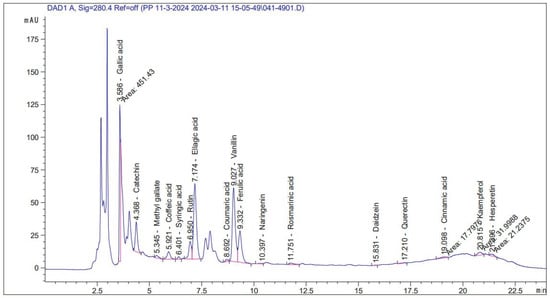 To separate and identify the chemical components of the extract, HPLC analysis was performed. This was accomplished by using an Agilent 1260 HPLC system with a Zorbax Eclipse Plus C8 column (4.6 × 250 mm, 5 μm particle size). The mobile phase used in the analysis was made up of water (solvent A) and CH3CN with 0.05% CF3COOH (solvent B). In the 24 min linear gradient elution program, 82% water (solvent A) was used for one minute, then 75% over ten minutes, and finally 60% over seven minutes. After that, the concentration rose once more to 82% over the next four minutes and remained there for the final two minutes. Throughout the run, the column temperature was maintained at 40 °C and the flow rate was kept constant at 0.9 mL/min []. A variable wavelength detector with a 280 nm setting and a 5 μL sample injection volume was used for detection. The extract’s components could be effectively separated and their chemical composition analyzed using this optimized method. Validation of HPLC analysis was achieved by an external partner, and their chart has been included (Figure 2; Table S2).
