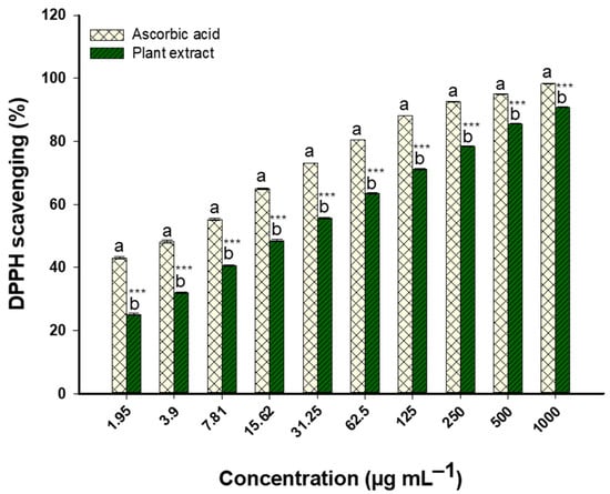 DPPH radical scavenging activity of Nitraria retusa extract vs. ascorbic acid (1.95–1000 μg/mL, n = 3). Different letters (a and b) on the bars indicate significant differences between treatments at the same concentration. *** p < 0.001 indicate significant differences from control group (p < 0.05, p < 0.01, and p < 0.001, respectively); (n = 3).