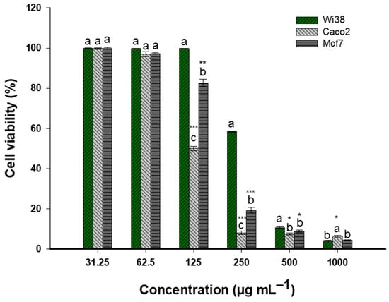 Dose-dependent cytotoxicity of plant extract on Wi38, Caco2, and Mcf7 cell lines. Data represents mean cell viability (%). Different letters (a, b, and c) on the bars at the same concentration indicate significant differences. *, **, and *** p < 0.001 indicate significant differences from control group (p < 0.05, p < 0.01, and p < 0.001, respectively); (n = 3).