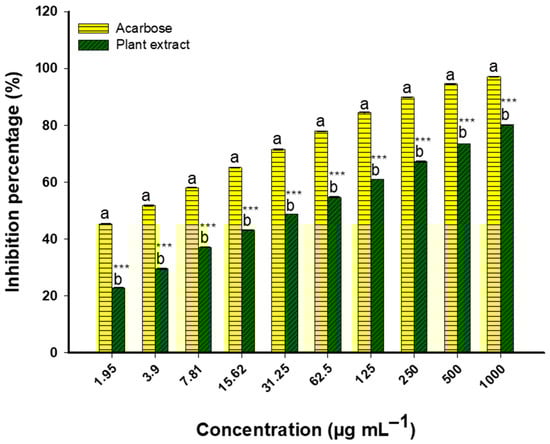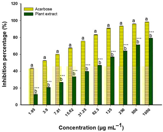 Profiles of glucosidase inhibition by plant extract and acarbose (1.95–1000 μg/mL. Different letters (a and b) on the bars at the same concentration indicate significant differences. *** p < 0.001 indicate significant differences from control group (p < 0.05, p < 0.01, and p < 0.001, respectively); (n = 3).