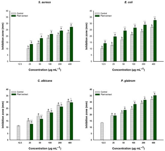 Antimicrobial potency represented as the inhibition zone (mm) of plant extract and control against S. aureus, E. coli, C. albicans, and P. glabrum across concentrations (12.5–400 μg/mL). Different letters (a and b) on the bars at the same concentration indicate significant differences. **, and *** p < 0.001 indicate significant differences from control group (p < 0.05, p < 0.01, and p < 0.001, respectively); (n = 3).