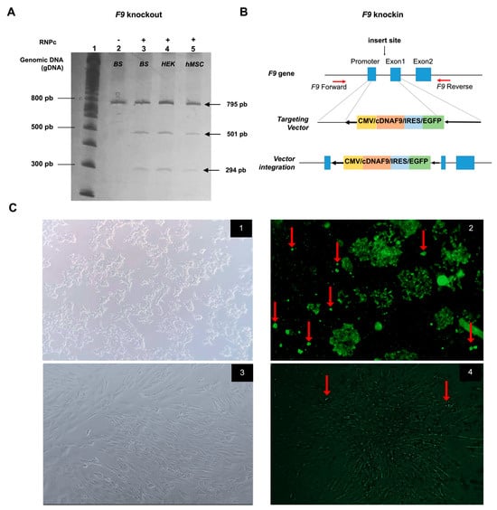 F9 Knockout and knockin in HEK293 and human MSCs. (A) Representative gel of RNP complex cleavage assay for F9 knockout in genomic DNA (gDNA) showing three bands after 37 °C incubation: (1) 100 bp Ladder; (2) gDNA from blood sample (gDNA_BS), negative control, without RNP complex (-RNPc) (3) gDNA_BS +RNPc; (4) gDNA_Lenti-X HEK293 (HEK) +RNPc; (5) gDNA_hMSCs +RNPc. (B) Gene pattern diagram of CMV/cDNAF9/IRES/EGFP template insertion for knockin in the promoter-exon 1 of F9 gene. (C) Images of cell models before (1,3) and after (2,4) RNP complex transfection. EGFP positive clones are indicated with red arrows. The experiments were performed using the fourth passage of HEK293 and hMSCs cell lines.