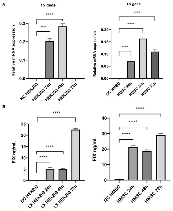 Overexpression of F9 gene and human FIX protein in Lenti-X HEK293 (LXHEK293) and human mesenchymal cells (HMSC). (A) Relative mRNA levels of F9 gene (normalized to GAPDH) measured at 24, 48 and 72 h (n = 3 for each group). (B) Human FIX protein in the supernatant of cellular models measured at 24, 48, and 72 h (n = 3 for each group). Error bar means SD of biological triplicate samples. Pairwise comparisons confirmed significant differences in NC models and infected cells (LX HEK293, p < 0.0001; HMSC, p < 0.0001), data are shown as **** p < 0.0001. NC: Negative control.