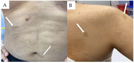 A 24-year-old male non-smoker was admitted to the Department of Thoracic Surgery and Transplantation, Pomeranian Medical University in Szczecin, in October 2024 due to a metastatic tumor of the right side of the thoracic cavity emerging from the inferior mediastinum. The patient’s medical history indicated the initial appearance of a café au lait spot in the left popliteal fossa at the age of 5 (Figure 1).
