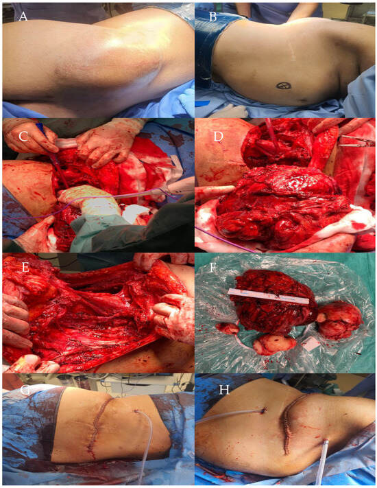 Preoperative image showing a tumor in the left retroperitoneal space infiltrating adjacent structure (A). Tumor in the left lumbar region visualized during surgery, showing extensive neoplastic tissue (B). Postoperative image showing significantly reduced tumor masses in the lumbar region after the initial resection (C). Image confirming the presence of a new tumor in the left retroperitoneal space, requiring further surgical intervention (D). Cross-sectional images of removed tumors from the left lumbar region and retroperitoneal space (E,F). Post-operative wound with the drainage system (G,H).