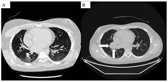 PET/CT axial plane. (A) Showing no lung lesions April 2024. (B) Lung metastasis July 2024 (white arrows).